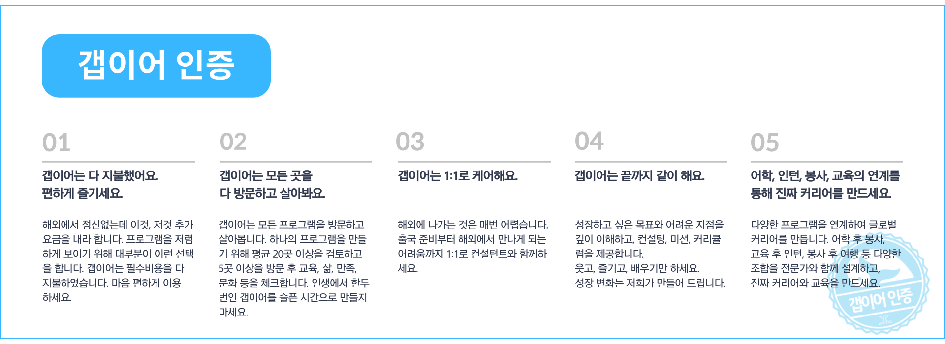 - 제공사항 : 갭이어 미션 및 노트 자동 신청 / OT자료 참가확정 즉시 전체 제공 / 긴급 인력 추가 배치 / 서류 필요시 준비 지원 등